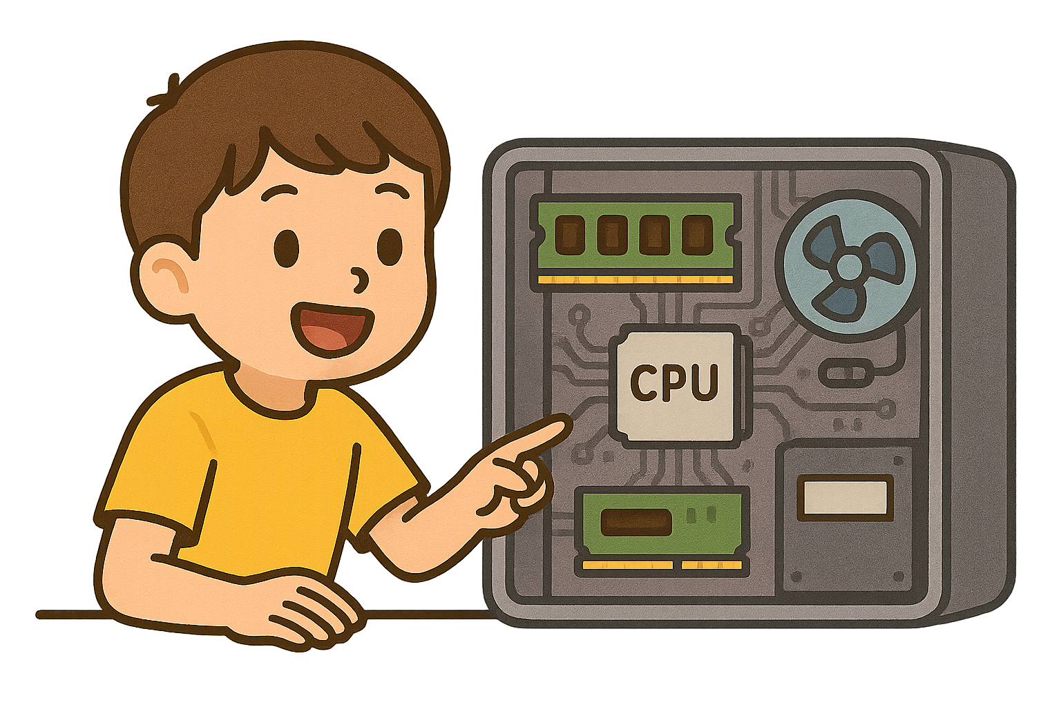 コンピューターは、見た目はただの四角い箱に見えるかもしれないけど、中にはいろんな大事な部品が入っていて、それぞれの仕事をしているんだよ。